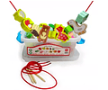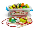 Entretenido set de 42 piezas de animales y alimentos para enhebrar. Las piezas vienen dentro de una caja plástica para poder transportarlas, cada pieza mide entre 4 y 5 cm aproximadamente.