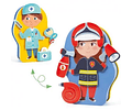 Jobissimo es una caja con silueta de metal sobre la que el niño coloca piezas de madera magnéticas, puede crear a un bombero, un médico, un profesor, un cocinero y mucho más.