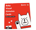 El set incluye tarjetas de alto contraste para 2 periodos del desarrollo visual: 0-3 meses blanco y negro; de 3-6 meses blanco, negro y rojo.