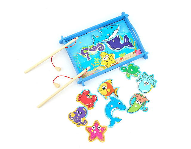 Entretenido juego de pesca que incluye dos cañas imantadas. Ayuda a desarrollar habilidades motoras y coordinación mano-ojo, además de vocabulario de animales del mar.