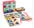 Juego de rompecabezas de animales de madera, piezas con animales y sus texturas, piezas que se pueden enhebrar. Incluye cordel, láminas de madera de animales y texturas.