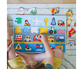 El puzle educativo Puzzlo Vroom de Djeco consta de 22 piezas que representa distintos medios de transporte, que deben ubicarse en su lugar correspondiente según el medio donde se transportan. Las piezas están hechas de madera y se adaptan a manos pequeñas.