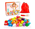 Set de enhebrado, fortalece la motricidad fina, desarrollo de la coordinación mano-ojo, coordinación visomotora y fuerza de los grupos de músculos implicados, también aumenta la autoestima, atención y creatividad a través de la realización de preciosas combinaciones con los llamativos colores de este juguete-herramienta de desarrollo.